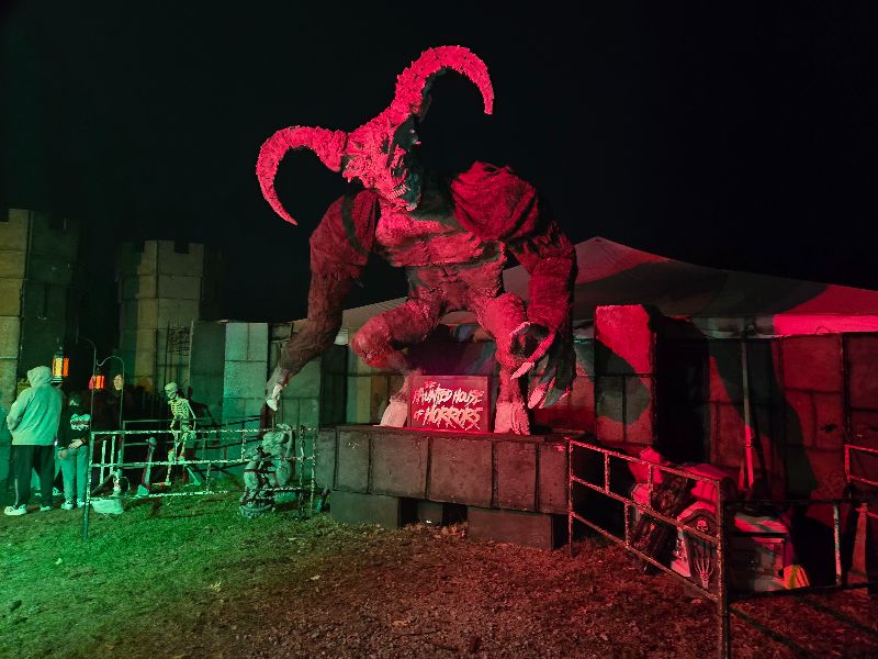 The haunt has a large demon monster animatronic out front with a stone look to the outside, the kind of resembles a castle. There was about a 3-minute wait between groups this night, and a short wait line. When I asked about the amount of time it takes to get through, they said about 15 minutes.