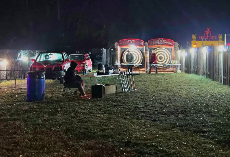 When you arrive, there are no signs by the road for the haunt, but you can see the lights. It’s mostly grass parking and some gravel roads. It sprinkled all day today, but the ground seemed solid, so I wasn’t worried about getting stuck in the mud.