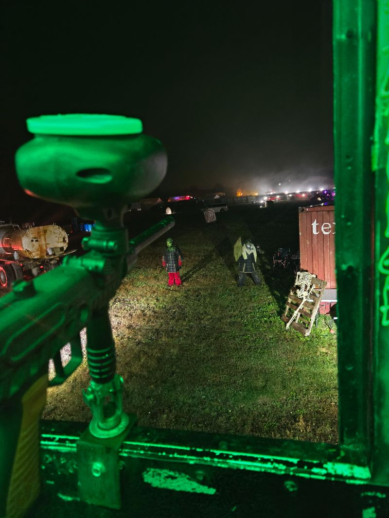 There were three separate areas where the bus took us. Each area had a few scare actors and other items to shoot at. Some items included vehicles, a boat, cargo containers, and some other small things. Some actors were moving around while others stood still. I had seen some comments online before I went about people feeling like they weren’t getting enough paintballs. I tried to pay attention to the number of shots I took since they just dumped a container in, and I can’t imagine them counting out exactly 100 paintballs for each one. I did lose count, but I easily took 30 shots in just the first area with little effort. It felt like I went through it really quickly, but I do think 100 paintballs would be fairly accurate.