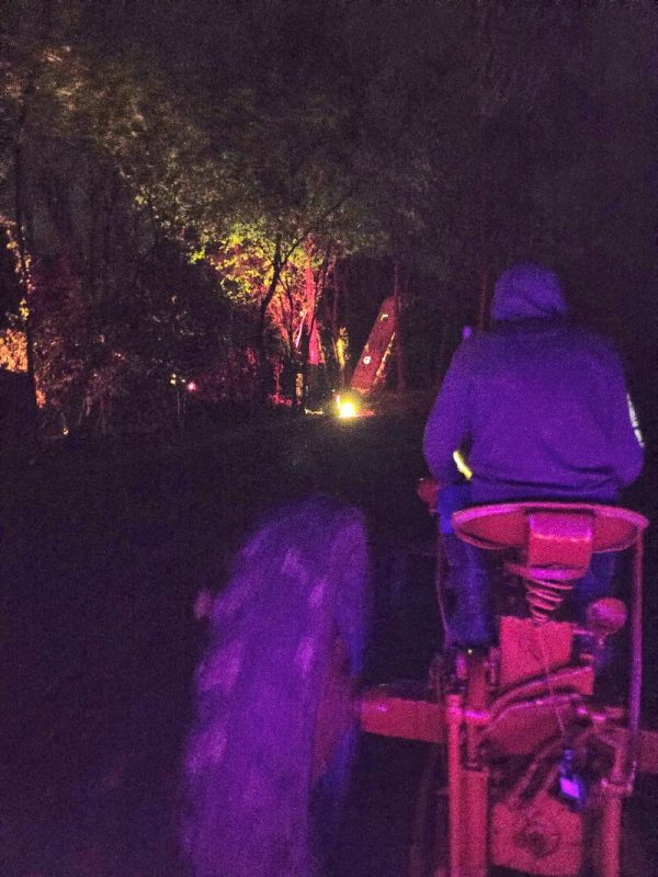 We took either the same route or almost the same route through the wooded areas as the Zombie bus. I think we took a trail that ran parallel to the zombie bus route, and the same scare actors worked both paths. I thought I could see a second path through the tree line that was more illuminated. The actors would approach the moving wagon, and one or two actually spoke to us. The actors on the wagon referred to them as their “friends” and waved to them. There was a moment that was funny, and we could see the actors running through the tree line, and another moment where a clown looked like he was hitting something in a caged area, but overall, that was it.