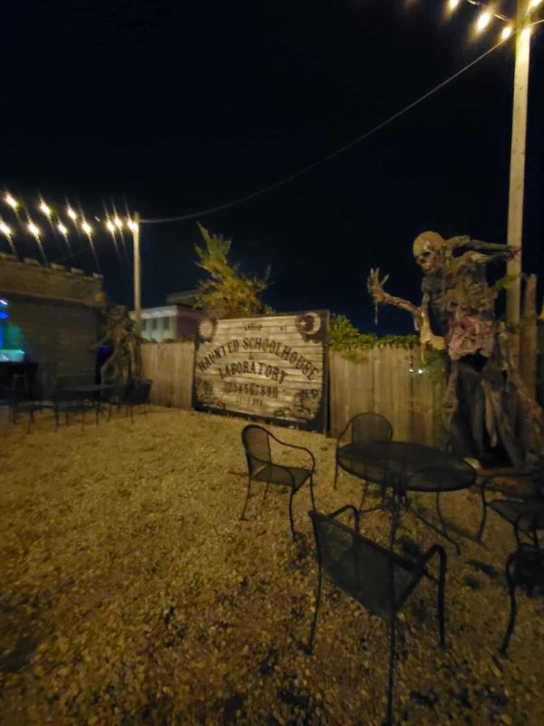 Drinks are available both inside the Schoolhouse and outside in the Midway, and a food truck offers savory and sweet snacks. Make sure to check out the merch store to the side of the castle bar, as they always have something new. The Schoolhouse and Laboratory have been frightening families for over 50 years, so you can choose from a vintage design that hearkens back to its early days, or one of the brand-new Karl the Kustodian shirts. There’s also an awesome non-alcoholic blood bag drink available at the castle bar that one of our members enjoyed.