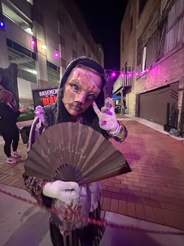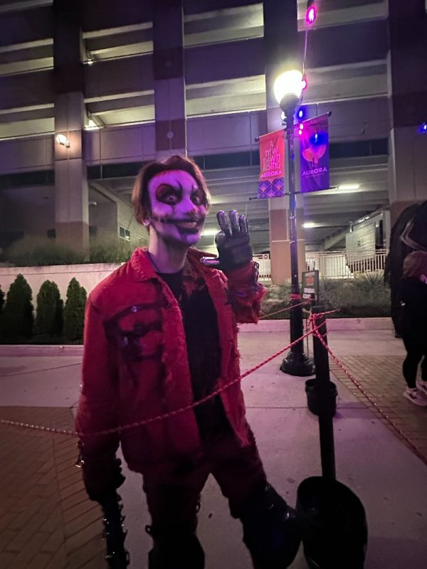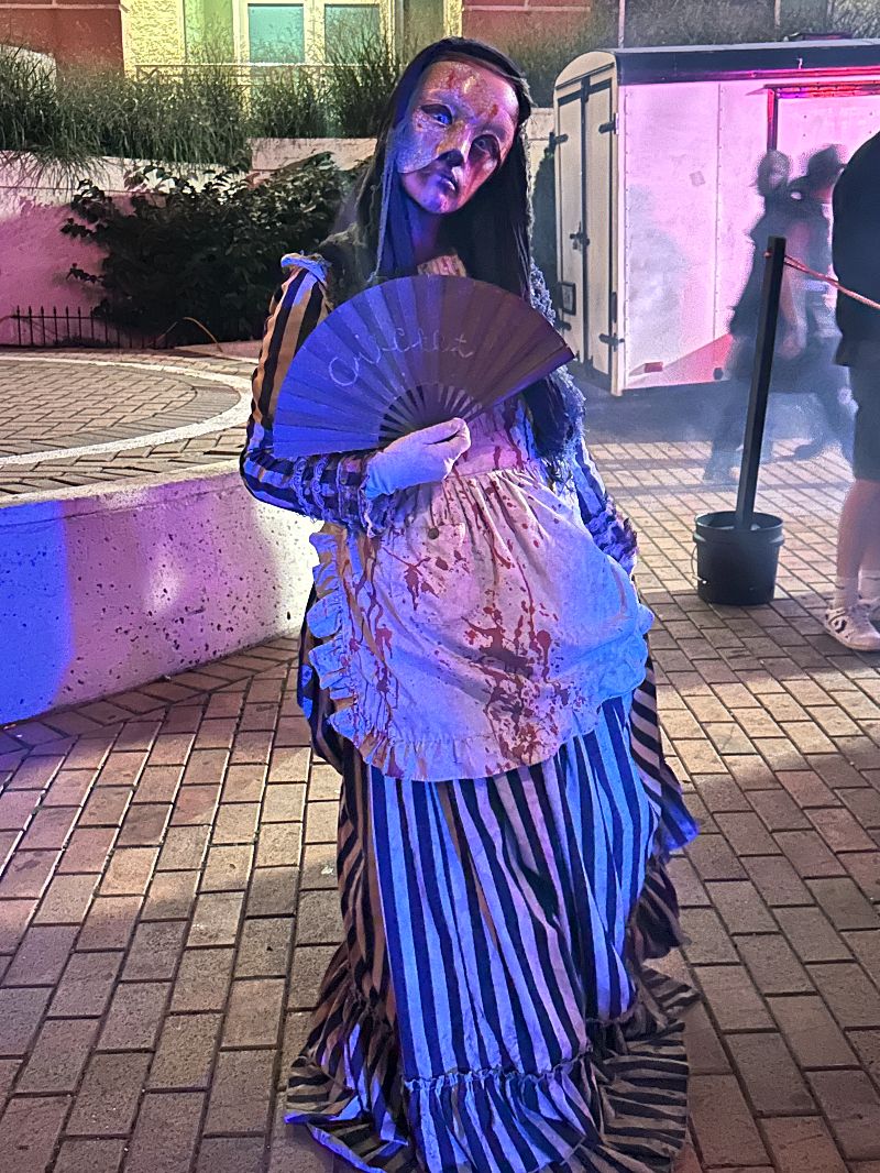 Out in the queue, a variety of characters were roaming around and interacting with the crowd. A rodent walked around in a hazmat suit and a pest control backpack sprayer, the hypocrisy! Cricket wore a striped floor-length dress with a hand fan displaying her name and a bloody phantom half mask with piercing blue eyes. Overall, the actors did a fantastic job displaying their unique characters efficiently.