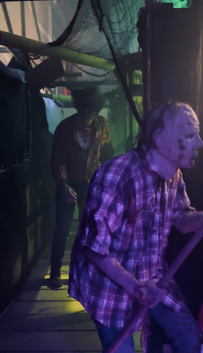 The cast of “A Nightmare on Station Road” gave a really enjoyable performance that brought the haunt’s shadowy world screeching into life. From the very first area, where hillbilly ghouls reached out from the gloom to clutch and shock, the vigor never let up. The performers were creative, dedicated, and fearless in getting close and grasping you, making an experience that felt both edged with fear and adventure. Each section introduced novel and unforgettable characters, from the zombie hillbillies wielding their tools to the hilarious Exorcism room that had us laughing out loud for the first time this season. The mathematician’s clever interaction, requesting we solve calculations and having us sign our names on the wall in fluorescent ink, was fun and a bit of a twist. And, of course, the Butcher was the most petrifying of all, emerging from the mist only to turn back and attack. With every encounter made to astonish and disturb, the cast hit a great balance between fear and entertainment. Oh, and choose wisely, because such a choice will determine your course and whether you meet the spirits, or something else…