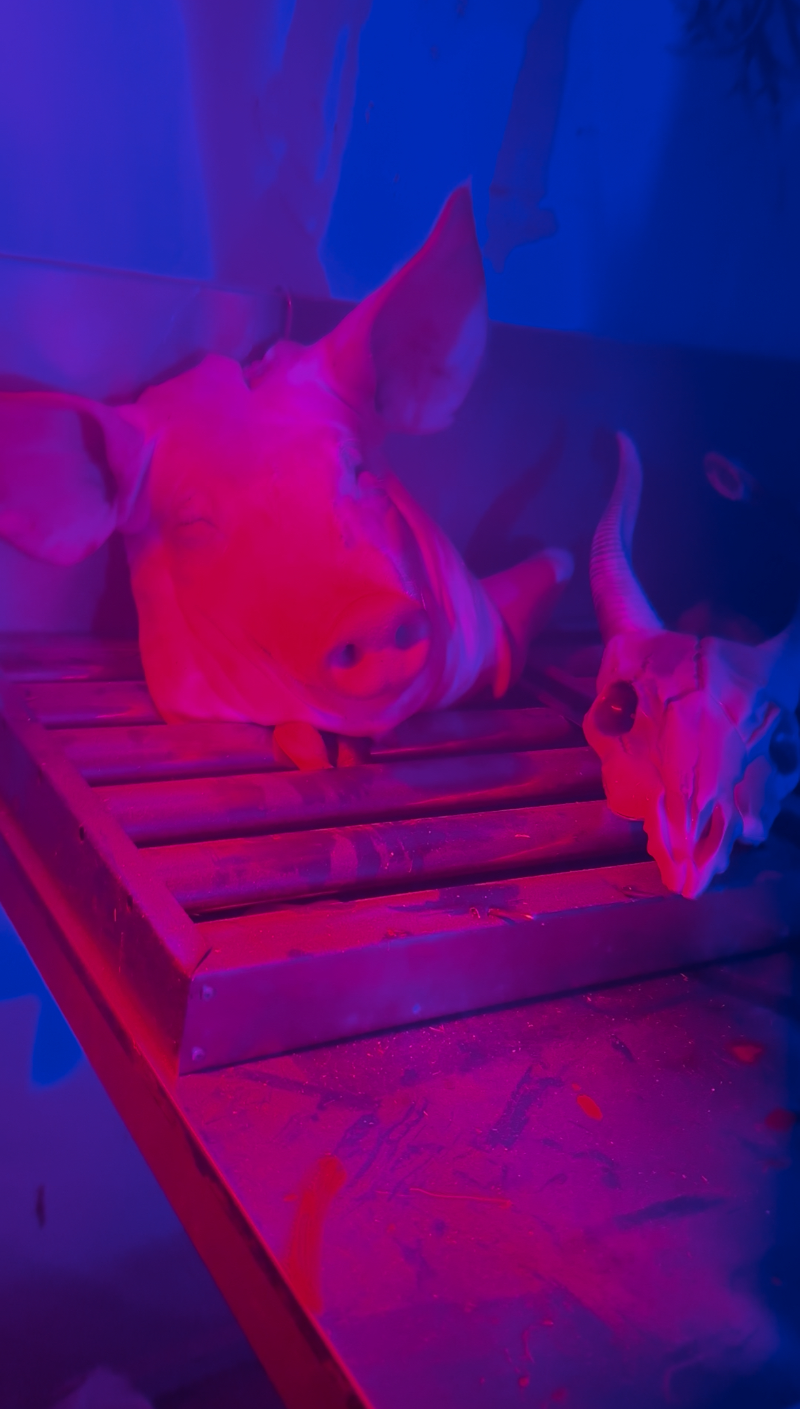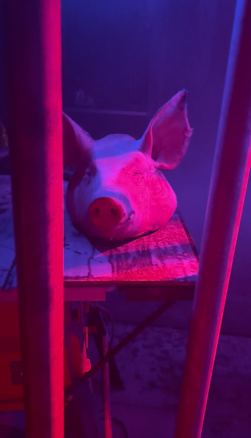 The structure for this haunt was fascinating. Apparently the world’s first purpose built, three-storey horror house! For a built from scratch haunt, we were pleasantly surprised with the amount and variety of special effects in this maze. Most rooms are full of fog and multicoloured lights, with some extremely detailed lighting design, and there’s a soundtrack in each and every room that fits the theme for that space. There are even timed lighting and black light effects, a fully realised bedroom and bathroom set, a room full of butcher’s implements (including REAL pigs heads!) and even a fun rocking chair animatronic. During part of the journey you travel via the River Styx, a themed bridge with a river soundscape, and at another point you enter a room full of balloons you have to wade through! One of the strongest scenes in terms of effects was definitely the execution room, which appeared quite realistic and disconcerting.