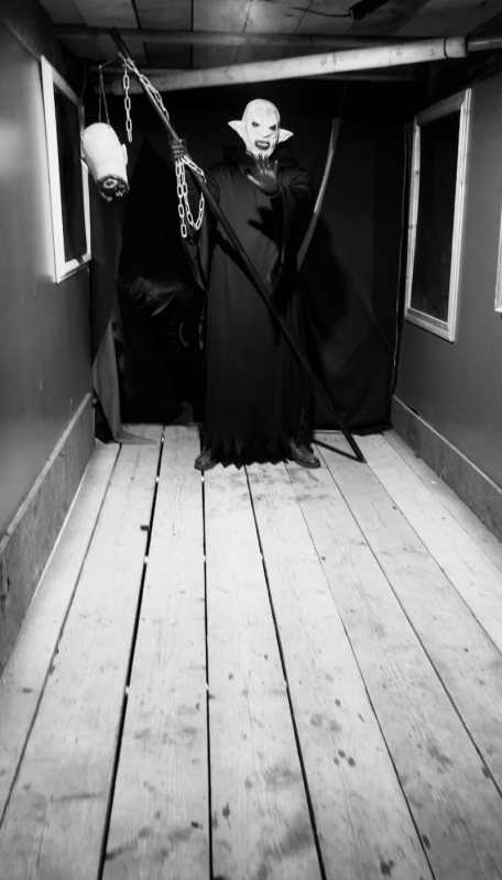 The costumes and makeup at Brackley Horror House were designed to bring each character into full existence within this nightmare. While full masks were used frugally, apart from a skeleton mask and the intimidating demon Grim Reaper, makeup ensured each actor looked part of the horror. The hillbillies stood out with their rotten, decomposing appearances, and the nun’s pallid, deadly face was disquieting. Iconic figures such as the clowns, the Butcher in his leather smock, and the demonic entity awaiting guests at the end of their journey all contributed to the haunt’s nerve-wracking nature. The only improvement might be to introduce a few more full-face masks to mix up the visual textures and augment the effect.