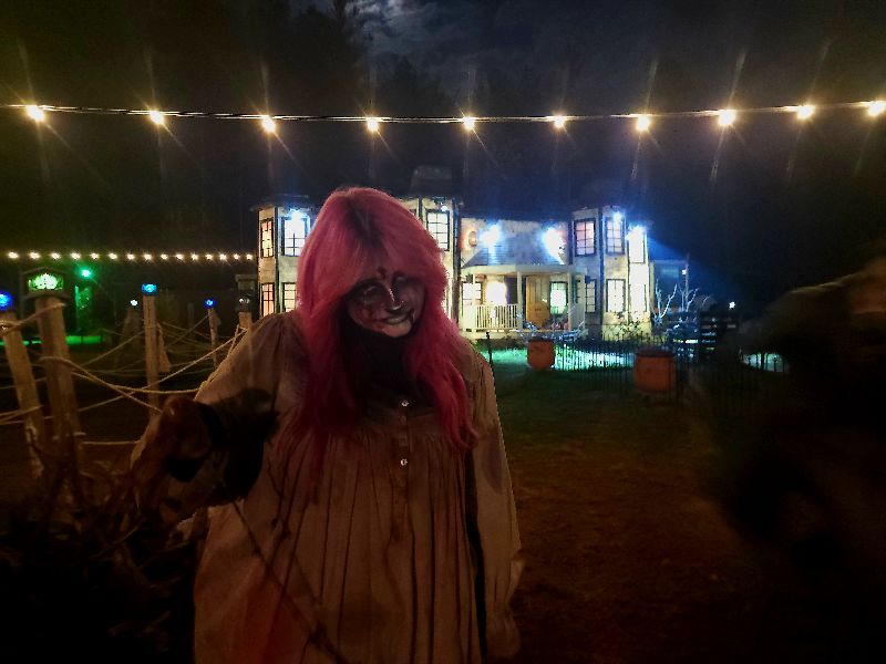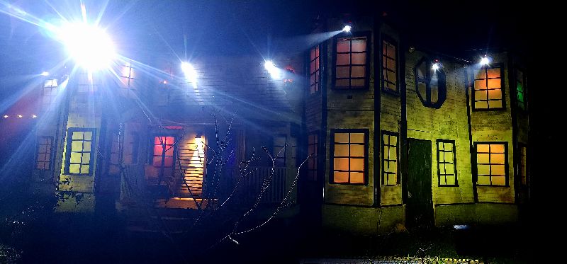 The face of the manor is lit up with spotlights searching for intruders and is the center of attention, with far more flashy attire. The forest was a dark, wooded pathway with limited lighting. The moon was not out, so it was even darker, keeping the spooky vibe. In front of Socko’s fun house, there was axe-throwing, keeping you in the feeling of the old carnival.