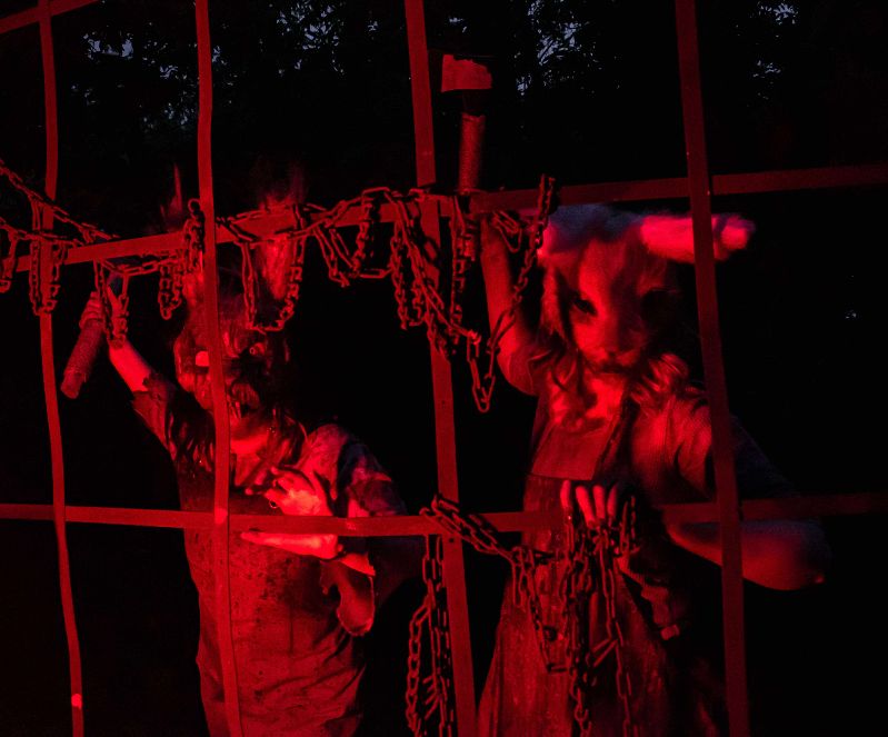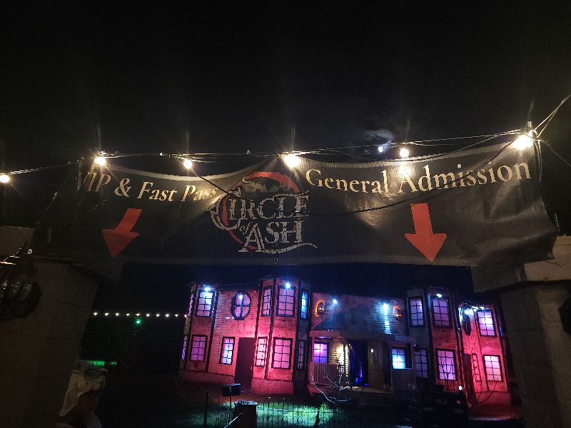 The cast of Circle of Ash was energetic even for the last night of the regular season. In Frightmare Forest, you had the slider spider that slid and jumped around the spider webs, the hillbilly zombies in the utility shed were in your face and didn’t back down from trying to eat you. The cast of Sockos Fun House was silent until you were in their space, utilizing the dense fog in the circus tent area. The carousel clown “Blitz” didn’t break character even when they recognized us! The puppeteer was very believable, not using much movement under the bag on his head. The residents of the manor knew how to use their space and utilize their rooms. One nurse was even climbing the wall in the operating room and only moved when the strobe shut off. Spark wall actor ran off and jumped on a table in the next room, taunting us with the sliding door.