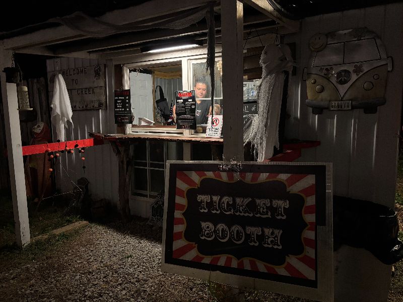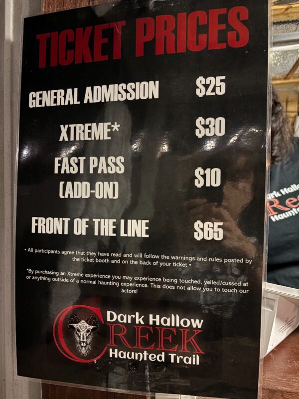 Finding Dark Hallow Creek wasn’t hard. A big sign was lit up out front and they also had a banner hanging above the haunt’s entrance. There was free parking on the grass and you could pull in wherever there was space. Below the banner, a sign let arriving customers know the ticket booth was straight ahead and it was clearly marked when you got there, with all ticket options on full display. General Admission was $25, an Extreme ticket was $30, and Front of the Line was $65. If you were in a hurry or it was crowded, you could also get an upgrade to Fast Pass for an additional $10. The trail was largely safe, minus some dark spots and minor trip hazards.