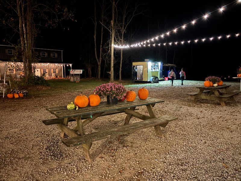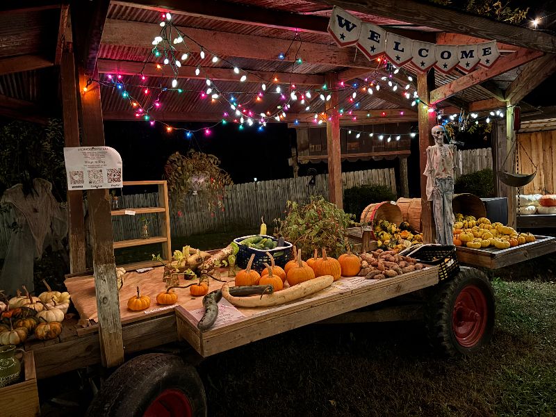 I knew I was in for an interesting night when one of the first things I heard was a roaring chainsaw, followed by people running for their lives into the square… oh boy. Rock and metal music blasted in the background to hype everyone else up for the show. There were plenty of spaces for people to hang out before or after the haunt, including tables covered in Autumn decor. Dark Hallow Creek is located on a farm and I noticed stalls where people could purchase pumpkins and produce using an honor system. I didn’t see any dedicated roamers, but every now and then a resident of the town would wander out and mess with people.