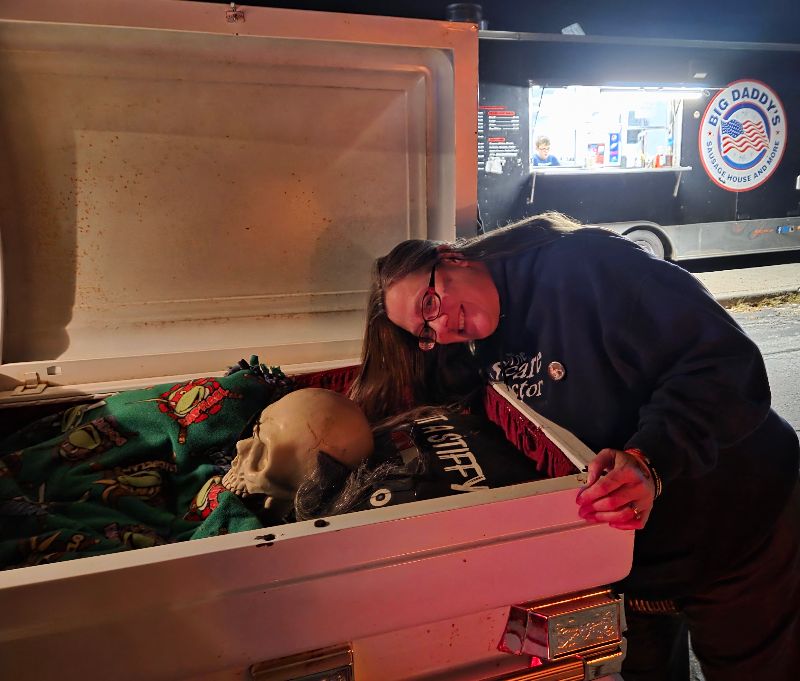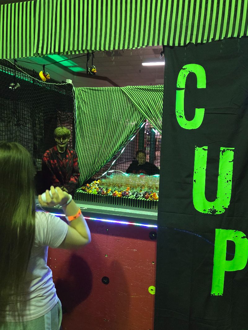 They’ve dressed the place up with props and photo ops, a display window of red-lit merchandise, and a whole facade of skeleton-lined stonework. Plus, there’s a zombie head on a post with a game of skill attached to it – it’s called Zombie Hooks, of course – and a new, pay-to-play carnival game booth called Cursed Cups. Like our other visits here, several actors roamed around the queue cutting it up with the crowd.