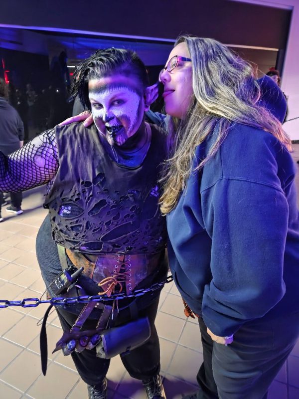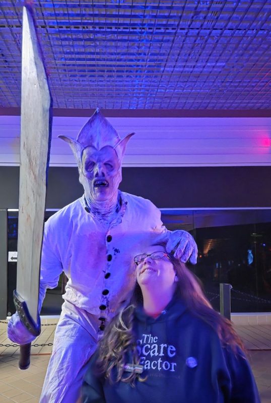We slid by a whining circular saw, traversed a hallway of hanging heads that brushed our faces with their long hair wigs, and watched video screens showing blood-smeared people eating questionable things. The most impressive set ushered us into a Chuck E. Cheese kind of establishment with video games, a stage, and large Five Nights at Freddy’s type figures.