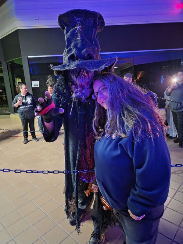 Or take a snap at one of the other photo ops, including a large backdrop of artwork dressed up with autumnal pumpkins, hay, and cornstalks, or an awesome monster with glowing red eyes, gaping maw of razor teeth, and batwinged ears.