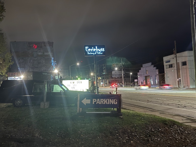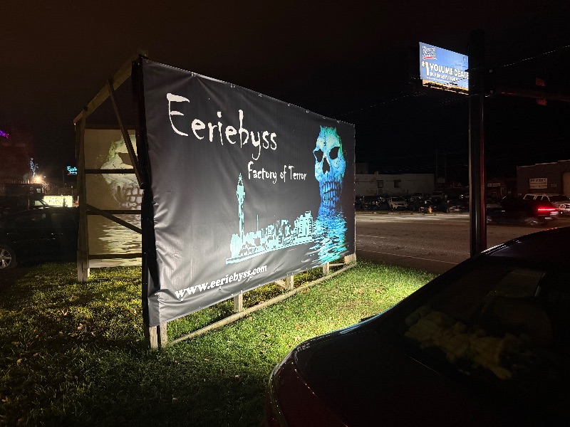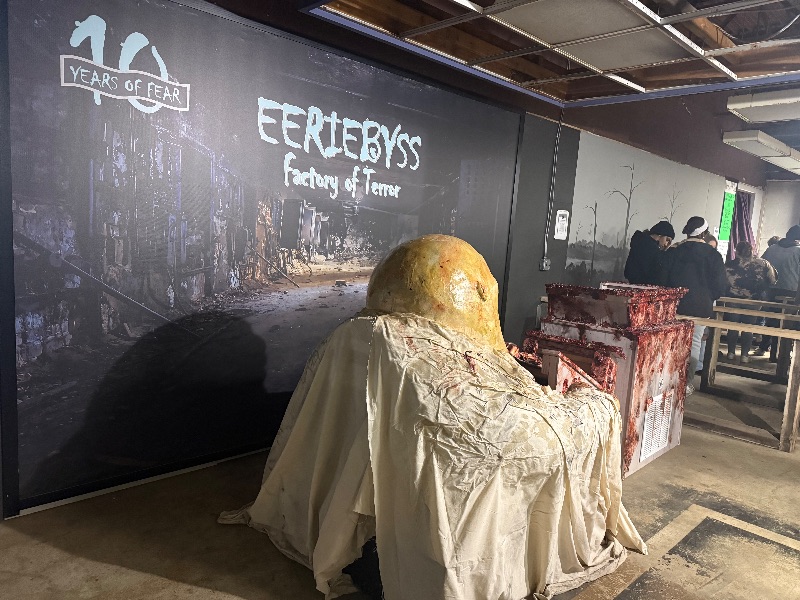 Seeking a new, professionally unreviewed haunt for the Scare Factor’s website, we chose to visit Eeriebyss Factory of Terror. Celebrating its 11th year, the attraction is in a 120-year-old building that keeps guests moving, as they repeatedly climb up and down various staircases. Navigating the building is disorienting; after climbing and descending multiple times, you lose track of which floor you’re on. Although we estimate the factory has four floors, it appears that only two or three are in use. This confusing setup makes it feel like you’re nearly done, only to discover more of the haunt remains!