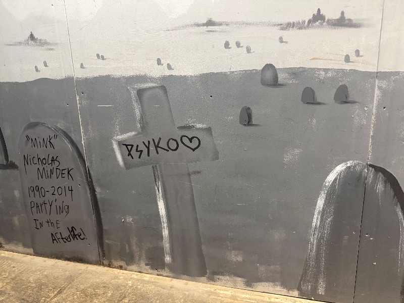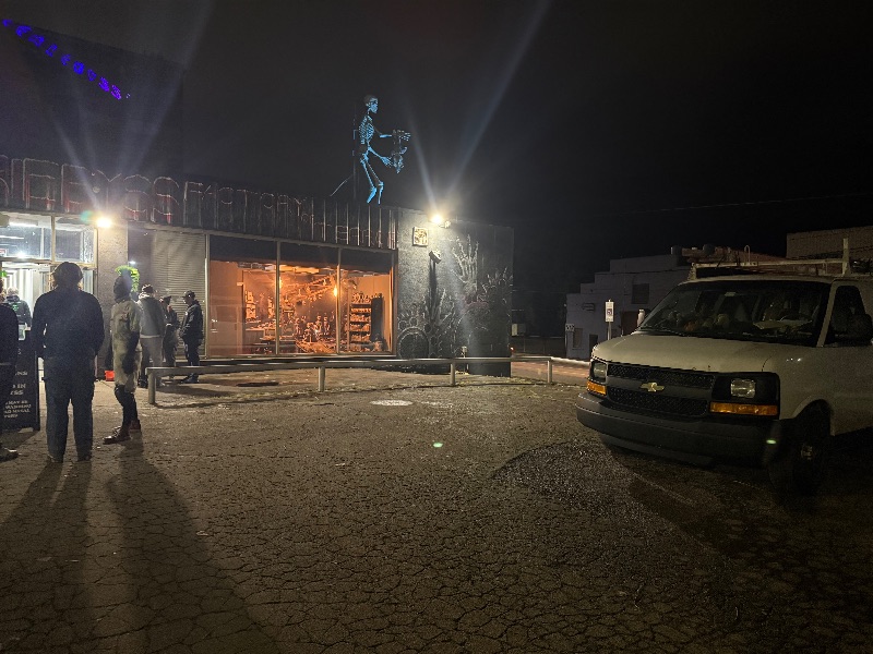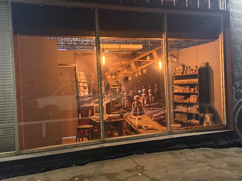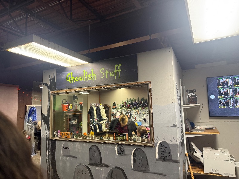 Upon arriving at the haunted attraction, we noticed that the outside line was uneventful, with just one queue actor interacting with guests and music playing through a speaker. It was unclear if the unsettling sound was intentional or if the speaker was damaged. Aside from some interesting window display details, not much else stood out. Once inside, there was a spot for a photo opportunity, a small merchandise shop, and a scare cam offering photos of guests’ scared expressions.