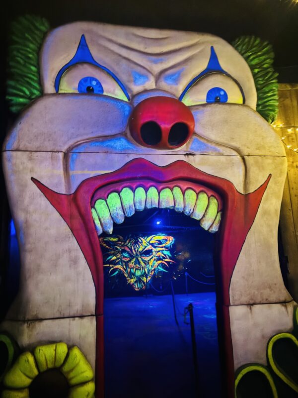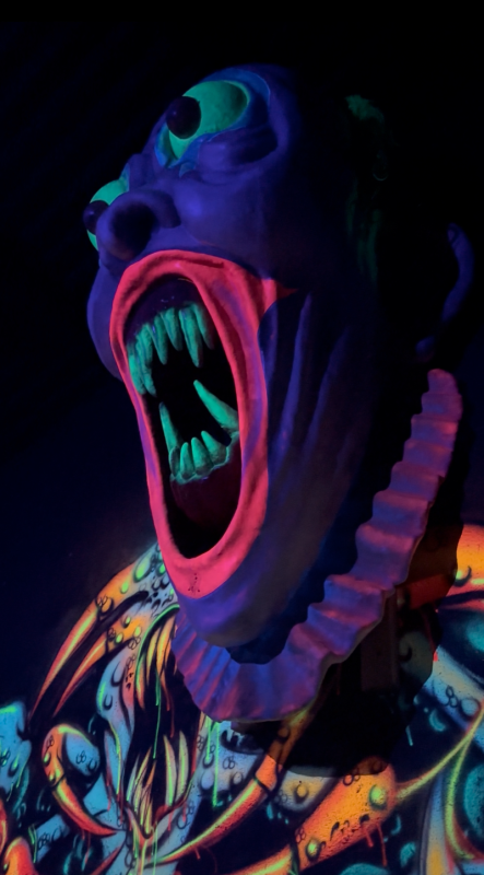 “Contagion” pushed in the opposite direction, exploding with colour and sensory overload. The combination of 3D glasses and fluorescent paint turned every surface into something that warped before us. Ramps, twists, sudden drops, and even a classic vortex added to the clown’s mayhem. The soundscape swung between carnival cheer and unsettling lullabies. It was as playful as it was disturbing, and the constant shifts in space kept us guessing.