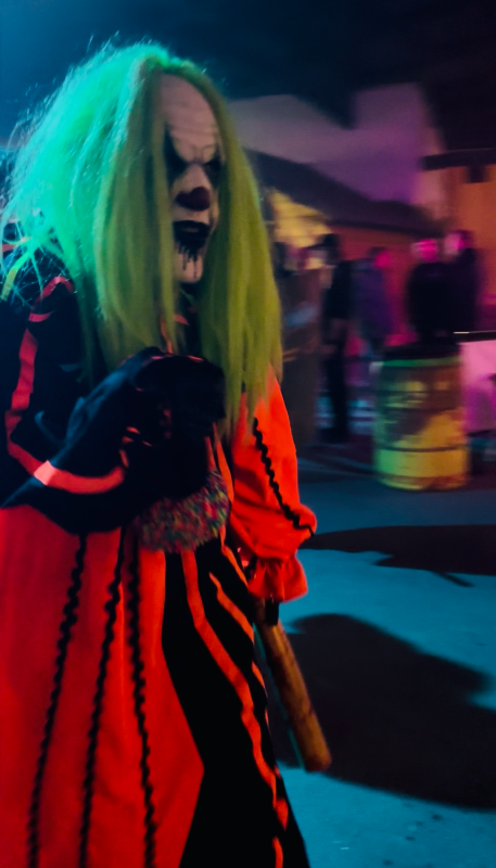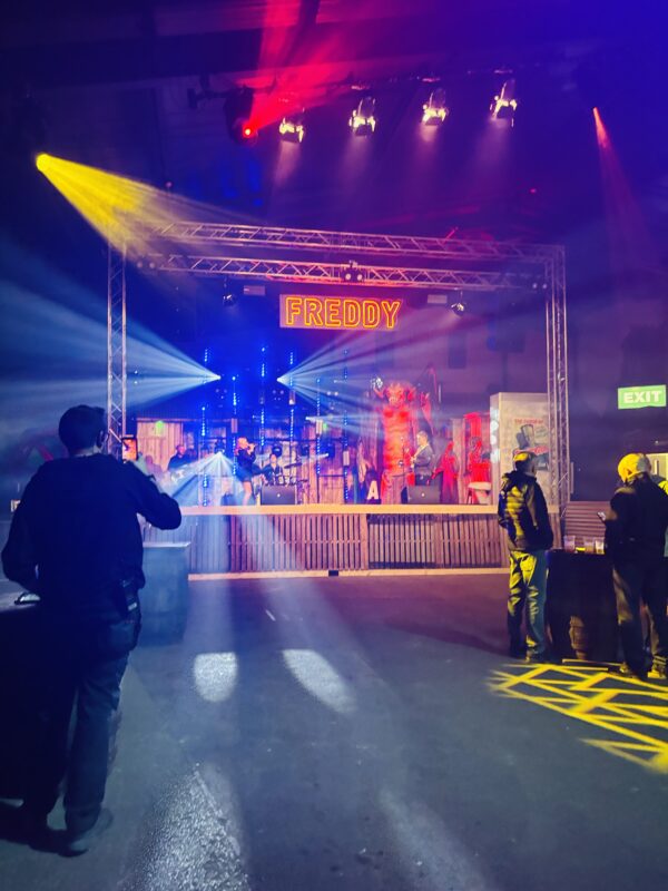 After progressing through the queue tent, you are immediately enveloped in the macabre chaos within the park. A highly themed central area branches into the different zones for each of the mazes. This zone itself is both spooky and fun, with stages named after iconic horror greats like Freddy. Pre-haunt lines kept this clear sense of worldbuilding, and whilst we’re keen not to spoil the surprises for you, this included large-scale animatronics and enormous set pieces that tickle the senses, preparing you for each maze.