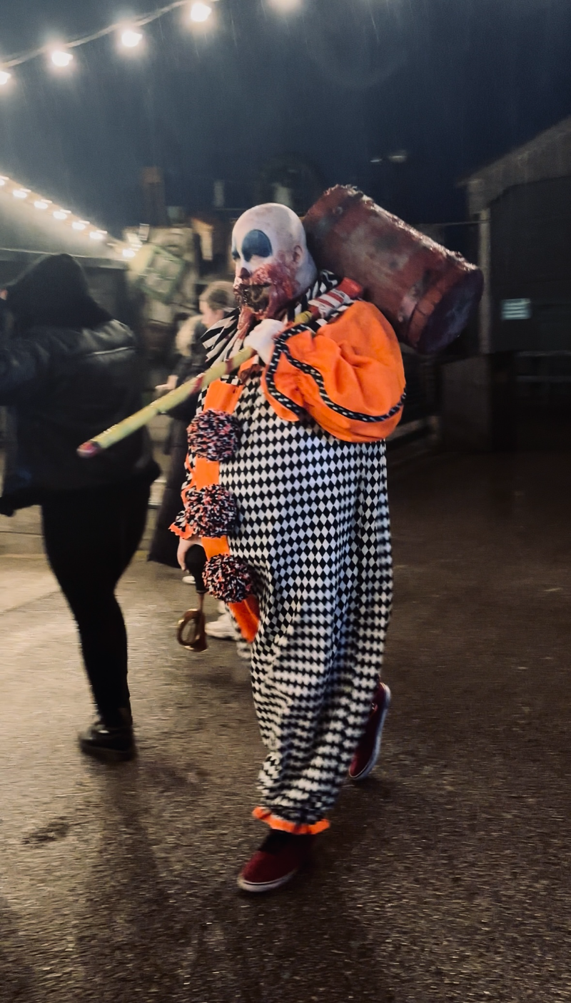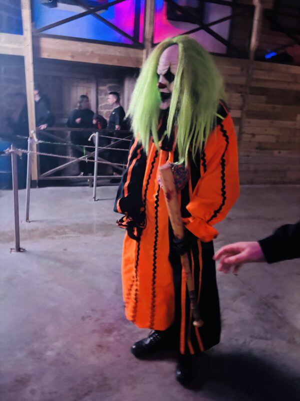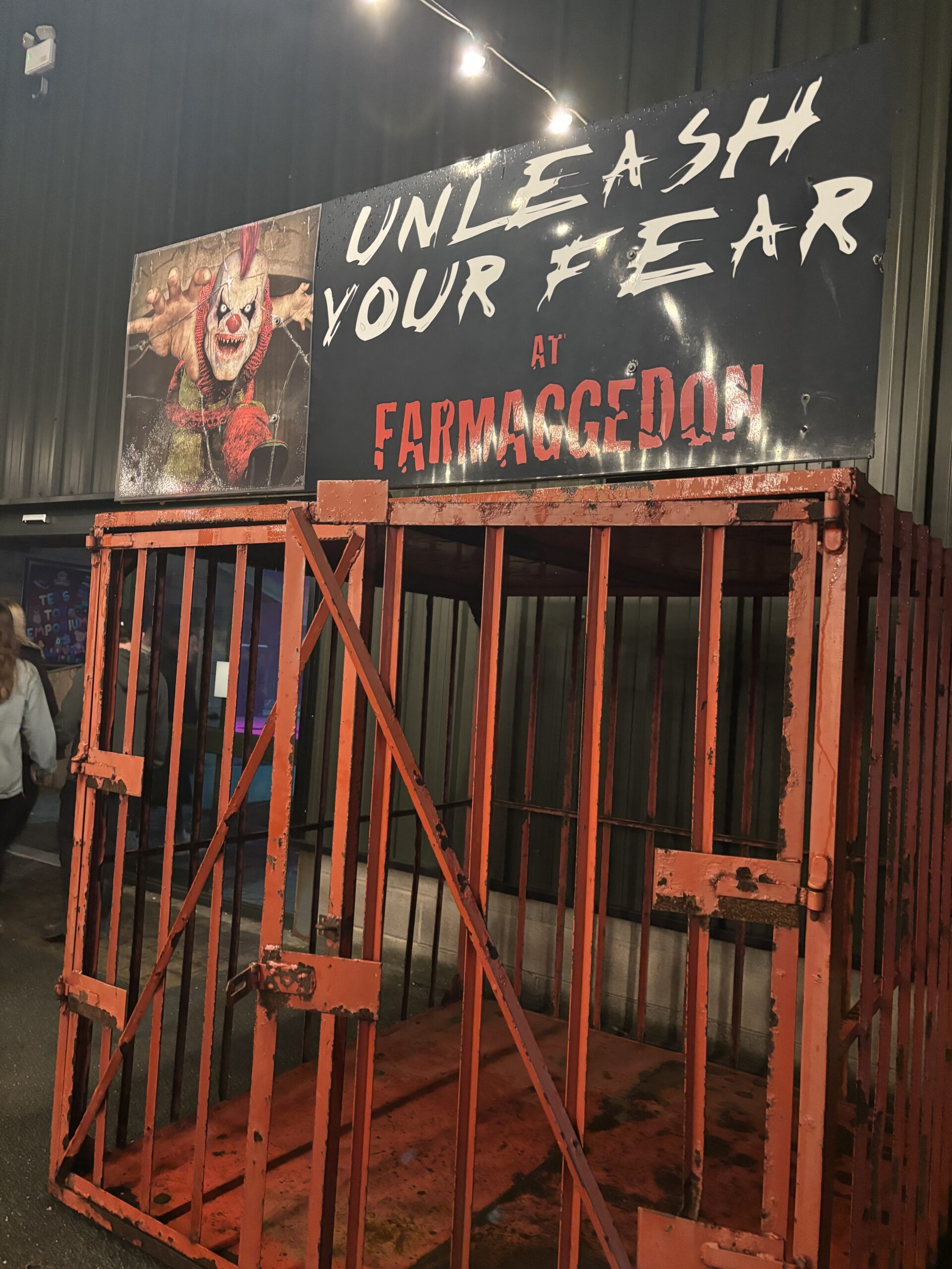 This scream park delivered an unrelenting barrage of scares, driven by its extraordinary cast. We’ve always felt that Farmaggedon is particularly strong in the cast department, and from the moment we arrived, the roaming actors made their presence felt. We encountered a grotesque tooth fairy fashioned from human teeth (!!!), a chilling nod to Art the Clown, who made sure that we got his close-up, and even Donald with the infamous Epstein files. These performers crept, danced in formation, pounced, and stalked, keeping us on edge the whole time. Even in line, the spectacle continued, with a caged cast energetically dancing before “The Beast of Terror”, an introduction (as we thought last time) unlike anything we’d seen elsewhere.