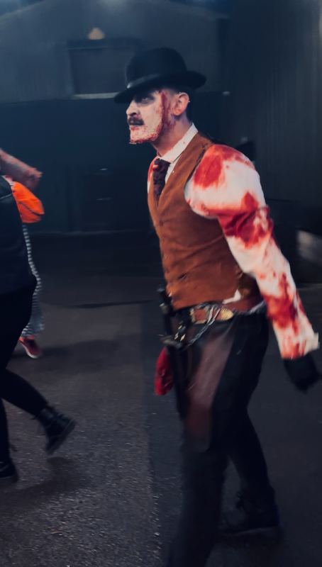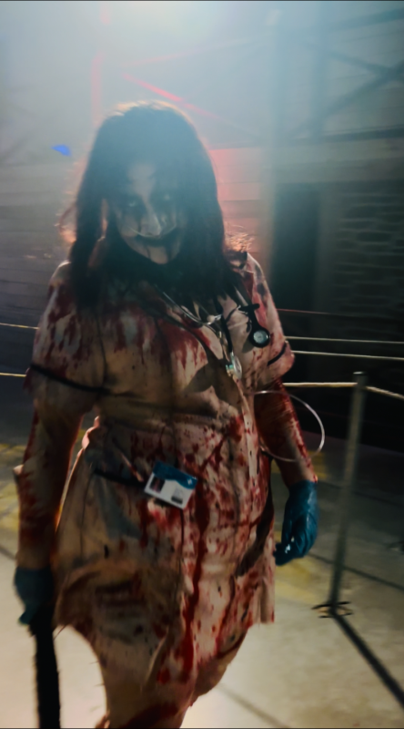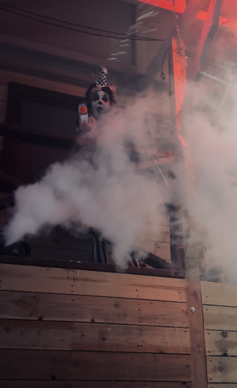 “Maze of Death” provided its own unnerving stratagems. Actors appeared above us, leaning over the maze walls, striking when we thought we were protected. The towering stilt-walker in the gas mask blocked the only narrow path out with his sheer mass, making the already confining layout feel even tighter and more claustrophobic; in fact, we had to duck under him.
