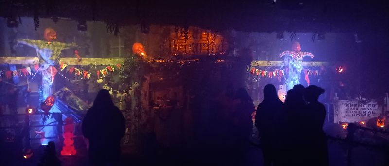 Dearly Departed: In the funeral home, we walked through a room with a rattling coffin lid and down a hallway of windows whose curtains were being blown about by a storm. Spirits floated on the walls, apparently the same apparitions that rearranged chairs into untidy stacks. Mr. Spencer had been neglecting maintenance in favor of his necromantic experiments, evidenced by the state of disrepair with exposed wall slats, broken windows, and tattered old-fashioned heavy draperies used as room separators. Standout sets included the science lab with brightly sparking electrical coils leading into a cadaver and the cemetery with statues, gates, and ivy and skeleton-covered walls. The soundtrack here included selections of old-timey jazz/big band/torch song music, and toward the end gave way to operatic chanting.