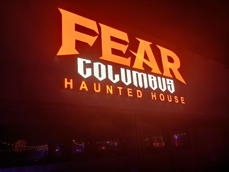 Fear Columbus is located at the Northland Mall in Columbus, Ohio. GPS gave us success in getting to the mall parking lot. Search lights, colored lights hanging in the large midway, blasting music, and an enormous, inflated jack-o’-lantern erased any doubt we had arrived.