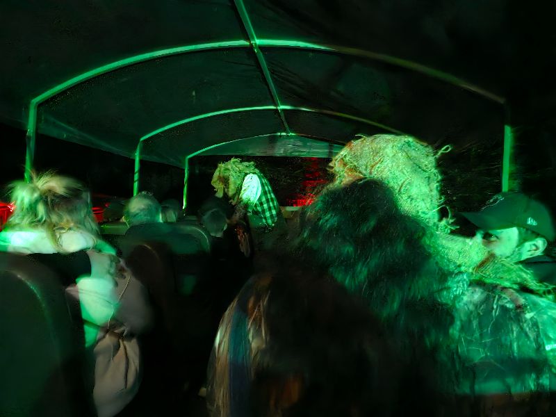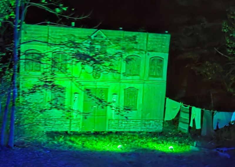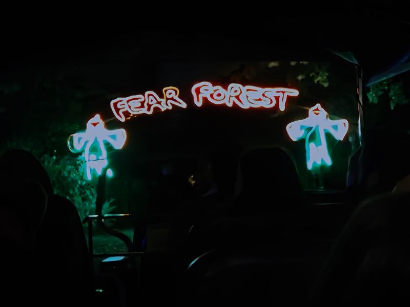 A semi came at us with smoke fuming out of its exhaust stacks and a hearty bray of its horn. We went inside a drive-through vortex tunnel with swirling kaleidoscopic colors and spacey music. Someone yelled out: “Am I on mushrooms or acid, man?” Good question! The surreal feelings continued with things getting Meta when we passed a mocked-up Fear Forest ticket window.