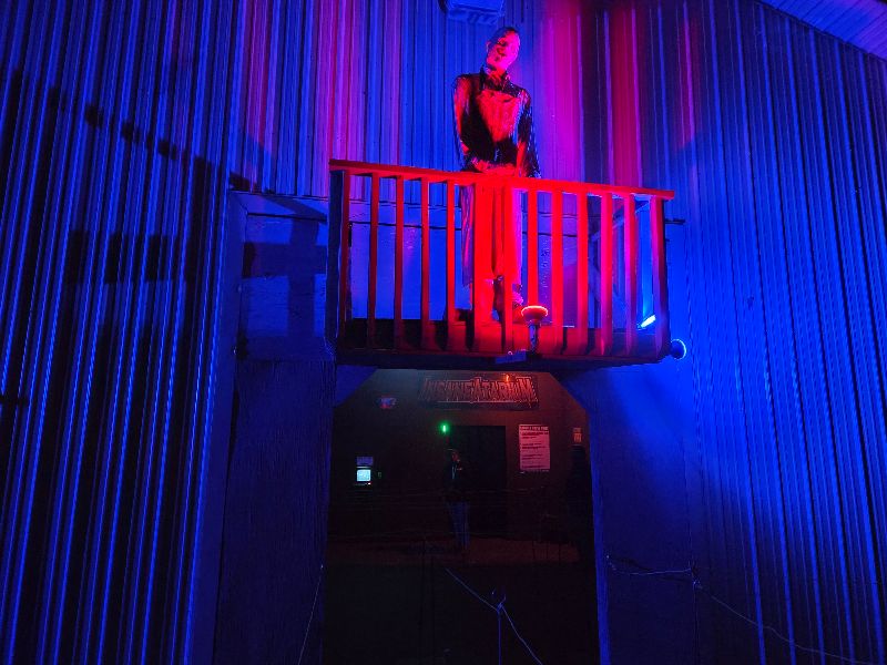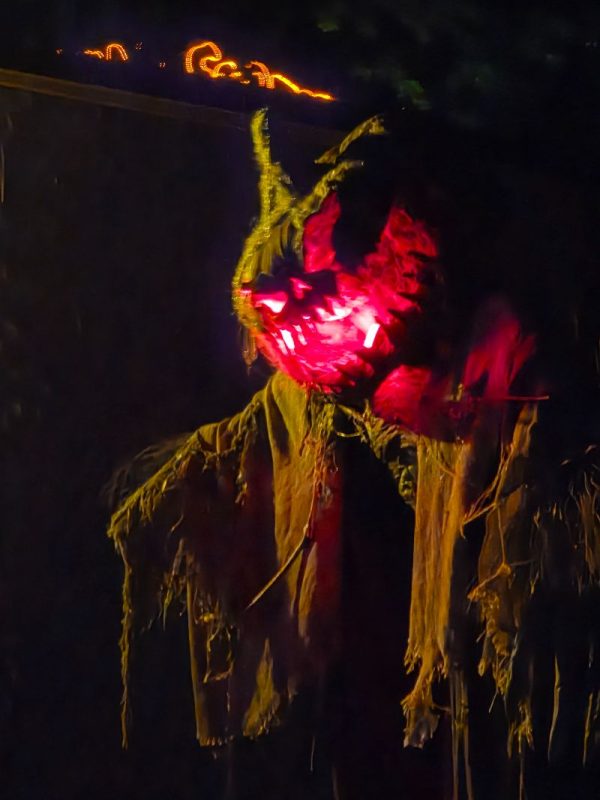 The hayride queue was at least much darker, and after that the entrances got much better. Insane-a-tarium was housed inside a spookily lit corrugated metal facade with a leering prop overlooking from a balcony. Psycho Path started under a tall wooden fence, the approach lined with skulls. Forbidden Cornfield featured a sinister jack-o’-lantern-headed scarecrow with glowing face holes.