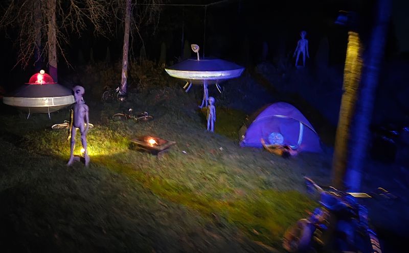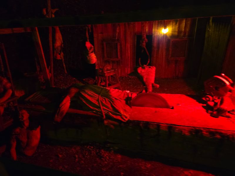 Hayride: The wagon, a tram vehicle with forward-facing, bus-style seating, began our journey under an arch with a colorful Fear Forest neon sign bookended by floatey ghosties. We saw an area swarming with hives and bees, a campground invaded by UFOs and alien figures, and a butchery section featuring a dummy being lowered into a meat grinder, a table saw complete with victim, and hanging meat slabs, all of it bathed in bloody red lighting.