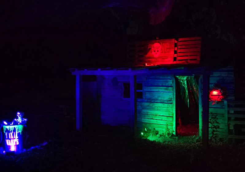 Once it is your turn to enter, you are greeted by an old wooden shackle that you must pass through to make it to the actual trail. When you reach the haunted trail itself, you will find a well-marked grass path lit with LED candles. The winding trail leads you through a variety of barns and shacks that you must survive. If you manage to escape, your hope will quickly diminish as you enter the werewolf forest. There are more than just wolves in those woods! Seriously, they hired a squirrel to shake random bushes and scare you for added effect, and it works!