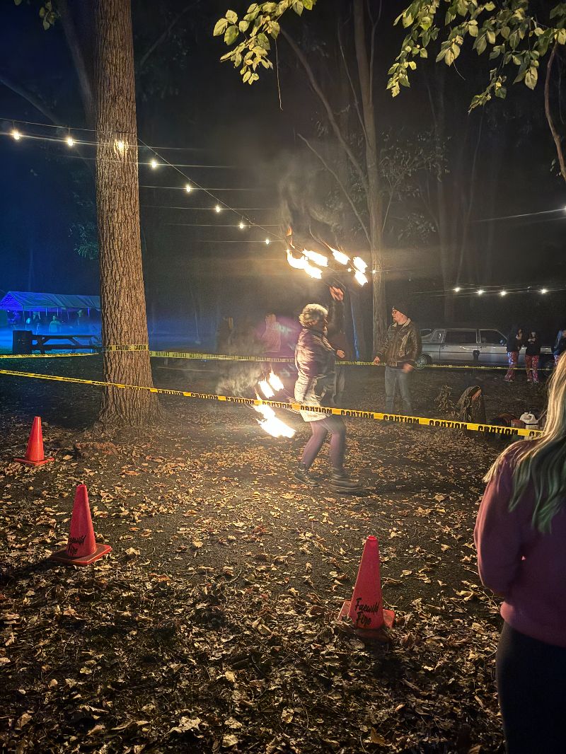 When arriving at the main midway area, we were pleasantly surprised by how it was set up. We saw plenty of bonfires going that helped a good amount of the crowd be able to warm up on the chilly October night. There was also some background noise, more than music being played, and we would suggest sticking to a more Halloween-themed playlist of music for entertaining guests. A very unique addition that FOF had was incorporating a live fire performer in the middle of this hub area. The performer did well in creating a show, and it was a very nice touch that not many locations incorporate. In this main area, we also saw a few queue cast members roaming around with visitors, but we did not experience them prior to us entering the main line.