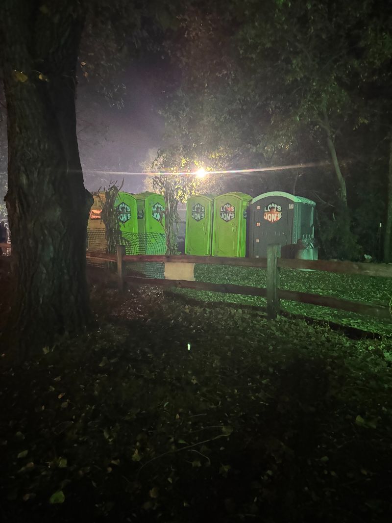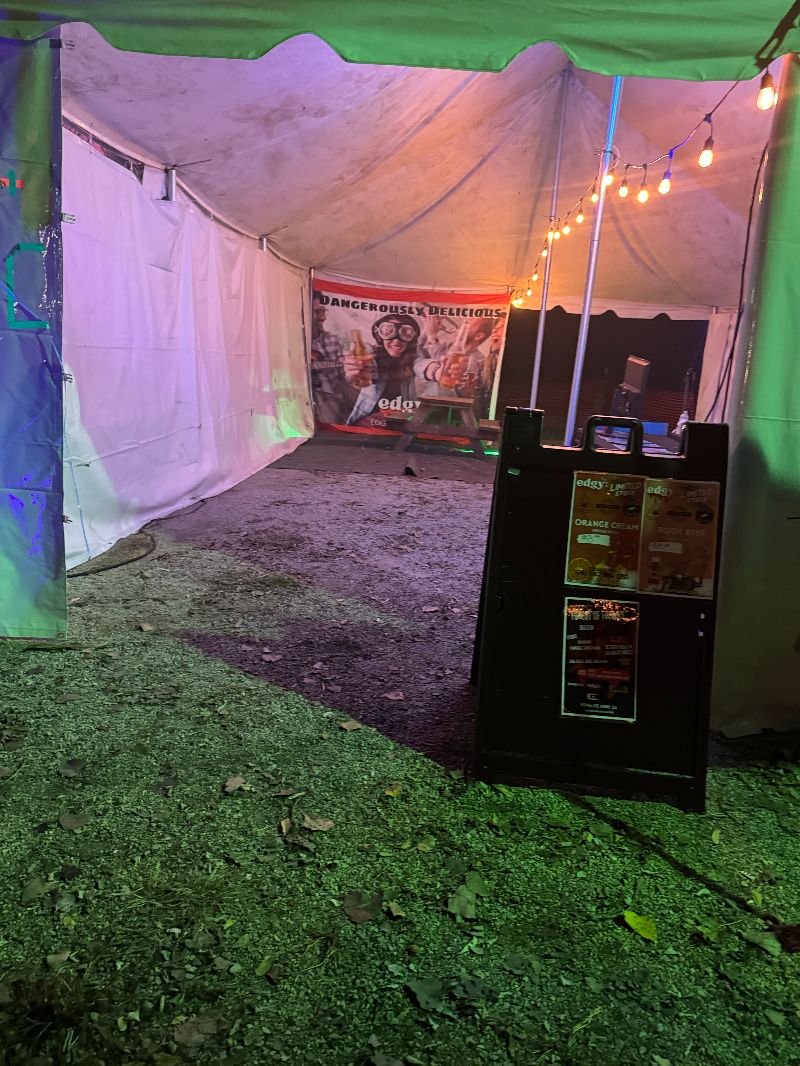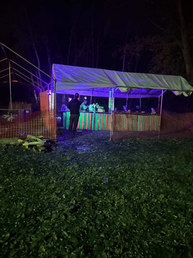 Once we completed the main haunt, we were brought back into the main midway area. In this area, you can find the bonfire previously mentioned along with a food area, porta-potties, and some tables to sit around at. This area also had a 21+ bar paired with a THC bar, which is something new and interesting that we have not seen before. This midway area is also the spot to find Shoot A Freak, which is a paid add-on to shoot paintballs at targets and an actor in a shooting gallery.