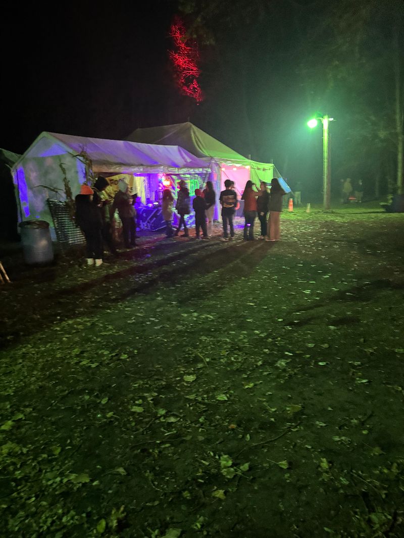 We also saw quite a few generic masks that didn’t match well with the plain outfits, making some characters feel out of place. There was someone dressed up as Michael Myers. This actor did very well in fitting the character’s image, but no other horror icons were present or fit the immersion of the haunt. On top of that, the lighting throughout much of the trail was so dark that it was difficult to appreciate any makeup or costume details that might have been there. That said, some scenes still managed to stay on theme. The clown neon room, for example, stood out for having a consistent look and vibe; everyone in that area fit the scene perfectly.