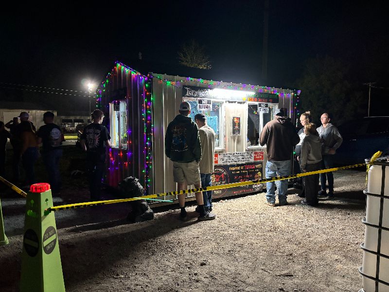 Flashing orange wands and cones in the road were meant to get the attention of oncoming traffic and help groups cross safely. The haunt’s drink and merch stands were indoors and had a sign pointing them out. Another custom sign and string lights made it easy to find the trail entrance. The haunt does have a loose storyline to tie all their different scenes together, and I would love to see this added to the website; they had everything else covered. Because this is a rural haunt and it’s sort of isolated, adding a sign or two further down the road in either direction would also help people know they’re going the right way.