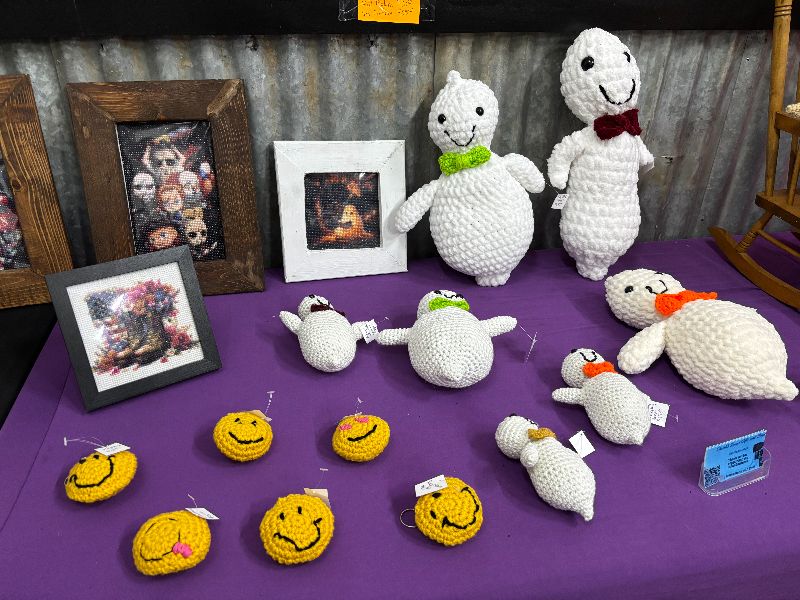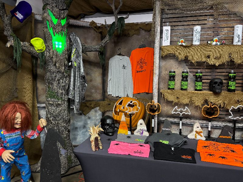 A howling wolf statue with glowing red eyes, the enormous skeleton clawing its way out of the ground, and other decor around the ticket booth made it clear right away that I’d just arrived at a haunt. In front of one of the buildings, a nice photo op had been set up under an even nicer Forsaken Forest sign. Out on the lawn, the DJ booth blasted fun tunes for everyone to enjoy. (Pay attention to what’s playing: the Forest has its own theme song!) Additional bits of Halloween decor had been added around the square. A fire pit and a burn barrel provided warmth to guests, and some tables were set up for those who had purchased drinks at the merch counter and wanted to hang out. Speaking of merch, a variety of fun Forsaken Forest goodies was available for purchase. There were also vendors selling crochet items.