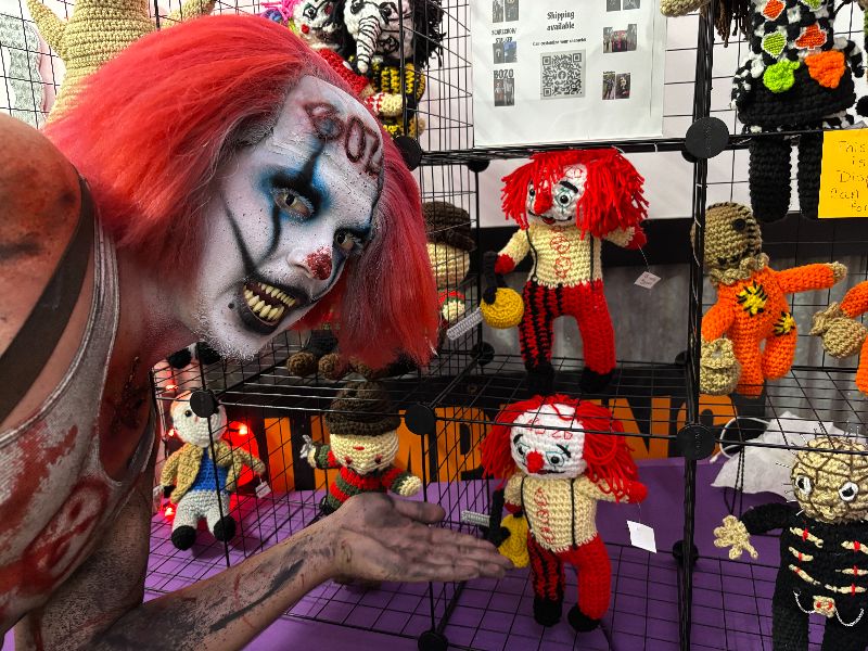 I met several roamers during my time on the property. Be forewarned: they can appear anywhere… out in the square, inside where the merch counter and vendors are, and even on the trail itself. A scarecrow wearing a suit and a dusty hat snuck into one of my photos, and it didn’t take long for the infamous Bozo to track me down either. I earned the nickname “Porkchop” for the rest of the night (don’t ask – long story).