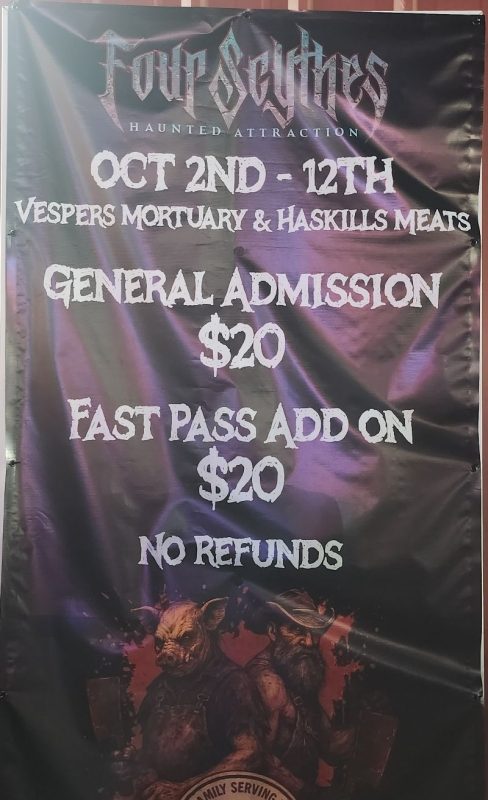 A general admission ticket to Four Scythes Haunted Attraction on the night of our visit (during the Cumming Fair) was $20. Visitors attending while the fair is in operation must also pay the $10 fair admission fee. Our walkthrough time came in at 13.5 minutes, resulting in a value of 0.45 minutes per dollar (MPD). While this figure is at the lower end compared to many haunts we visit, it’s important to remember that your ticket purchase helps support a worthy charitable cause.