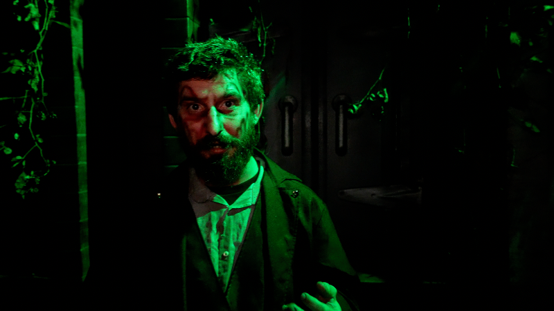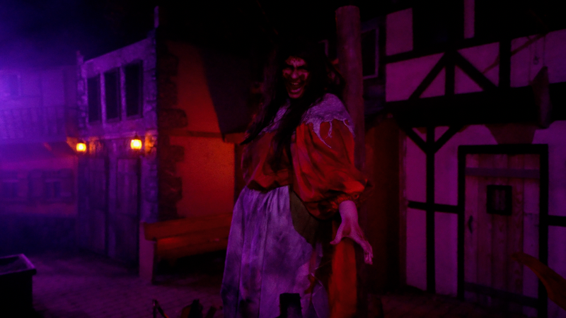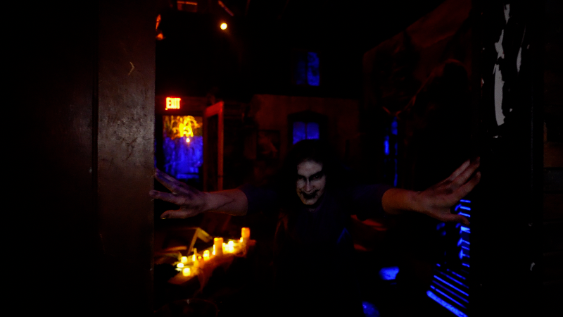 As we entered the house’s first themed area, a cast member wielding a shovel greeted us, pretending he wanted to bury us. Throughout our journey in the Hallow Grounds, other cast members stayed in character and were engaged with us. We then advanced to the Cursed section, where witches attempted to perform rituals on us, aiming to make us their next victims. The other cast members in this part played the unfortunate former victims of the witches. These cast members were very engaging and interactive with us.