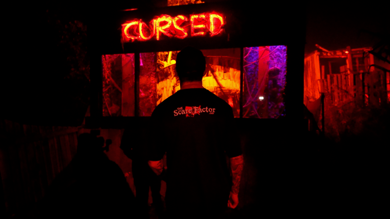 When arriving at this attraction, you do not wait in line at all. Instead, they have a number board, and they put a number on your wristband, and about 50 patrons board the hayride. While sitting outside in the midway waiting to go in, you can see the haunted house in the distance with its flashing lights, which looks creepy. After getting off the hayride, you will need to wait in a small line to get into the haunted house. This is only a 5-minute wait. While standing there, you get a creeped-out feeling because outside of the house, you can hear some of the actors and patrons screaming from a distance, so you don’t know what to expect.