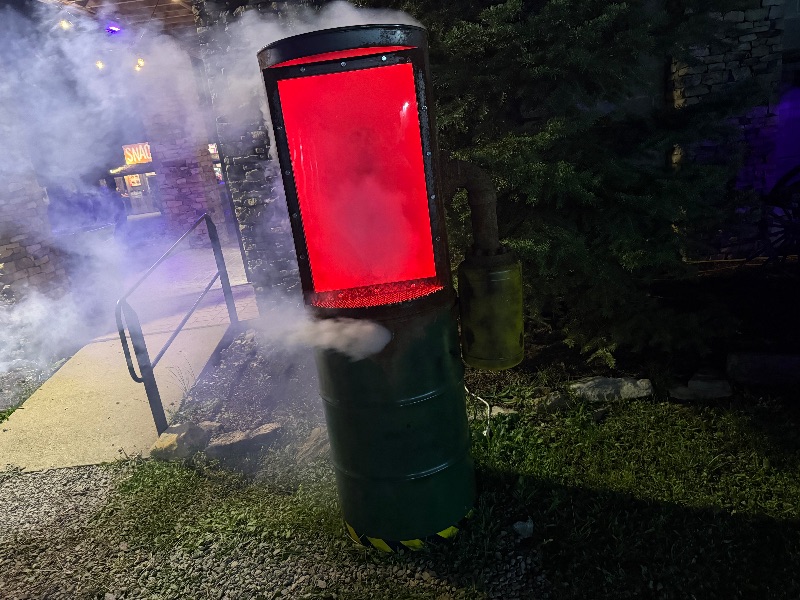 We experienced a wide variety of sound effects throughout the attraction, and the speakers were consistently loud and clear, helping create a highly immersive experience. Some highlights included low-lying fog rolling from the cemetery, dramatic fire effects from the alien UFO crash, and a cast member with an alien gun that exploded loudly. Other memorable moments were two large skeletons singing, a dragon animatronic blowing fire, and the entertaining clown barn scene. In this scene, a cast member was shot out of a cannon that exploded, but when the stunt failed, the ‘wah wah wah’ song played, adding humor.
