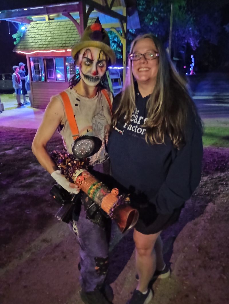 Train: Not as many freaks populated this shortest of the attractions, but the ones who appeared really made their presence felt. Art freaked us out big time, silently following us around and using various noisemakers to startle us several times. Another enthusiastic (but non-Art) clown seemed to be arguing internally – “Oh, new victims!” “No doctor, they’re patients, not victims, doctors don’t do any harm.” “Aaaaahhhhh, let’s get crazy!!” A demented chainsawer had us scrambling for the exit.