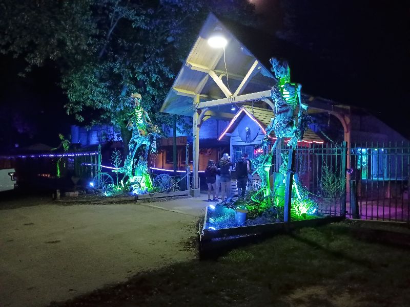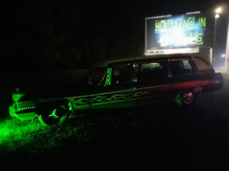 The place permeated a great atmosphere. A hearse sat parked beneath the huge attraction sign. Music filled the night air. Towering skeletons stood guard over the ticket booth, and colored flood lights bathed the buildings in eerie shades.