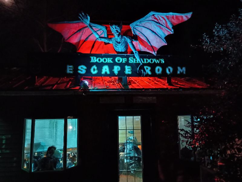 Extremely narrow passages led to filmic phantoms in quick succession: the Saw room with Billy in a bathtub, a Terrifier room, a Leatherface room, Freddy’s furnace room with strobing and fog, a Hellraiser room with Pinhead prop, puzzle boxes, and dangling chains, and the Exorcist room featuring freaky possessed dummies.