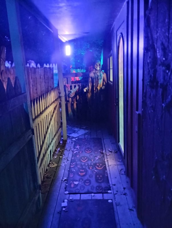Outside, we found Sam from Trick ‘r Treat, melonheads, and a palette leading to an It area. This was the shortest attraction, but it was positively packed with props like a fabulous witch animatronic with voice recordings and animated eyes, a glittery winged pig, a mini-clown, a bubble blower device, and a huge spider.