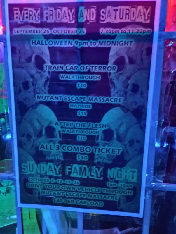 Haunting in the Hills is located in Onsted, Michigan, about an hour southwest of Detroit. It was already easy to find by GPS, but the extra big, extra bright sign just made it that much more so.