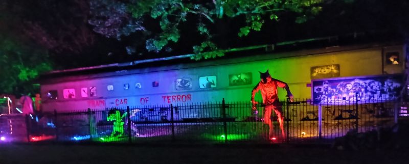 Train: Tight corridors ideal for ambushes ratcheted the tension, which was paid off by actors and animatronics. Hideous props and dummies had us recoiling and cringing. Art got us good several times, and kudos to the final actor for a solid chainsaw ending. Between claustrophobia, spiders, and other big predators, clowns, and the familiar terrors and trappings of our favorite scary movies, this choo-choo ride had us tied to the tracks of a whole range of phobias.