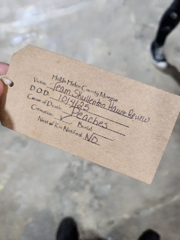 One particularly unique touch was the toe tags given to guests before entering. Each tag listed your “date of death” (today!), a cause of death, usually tied to a character, like “Death by Peaches” or a darkly humorous fate such as “Death by Cruel Irony.” They even noted your postmortem preference of cremation or burial… without asking your permission, of course!
