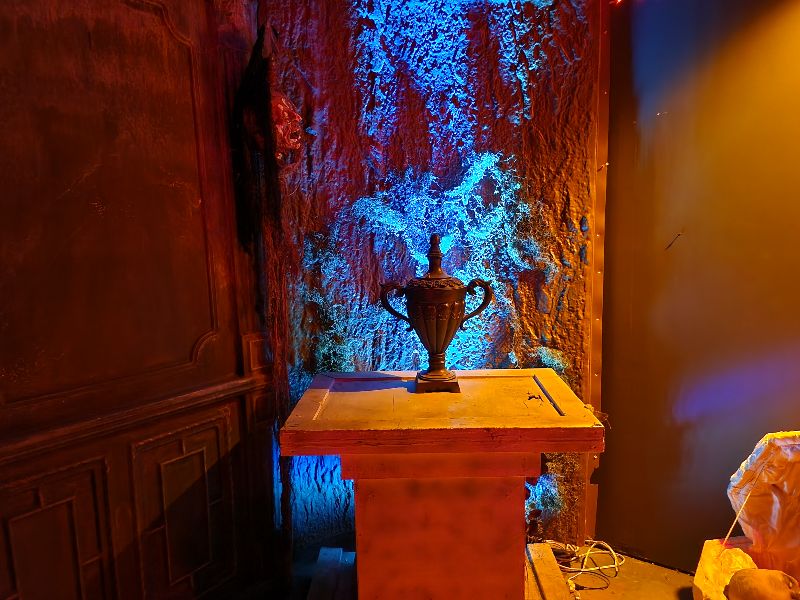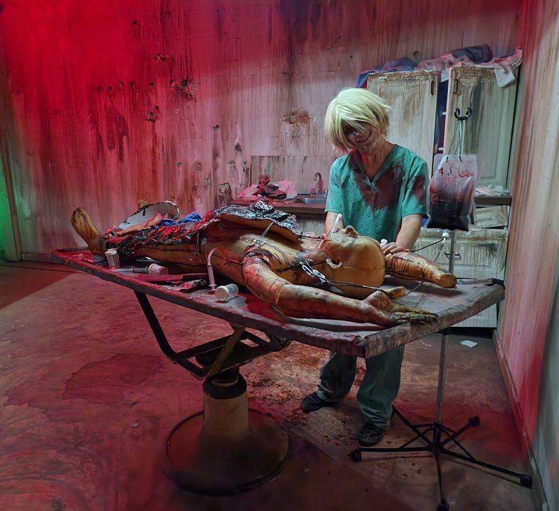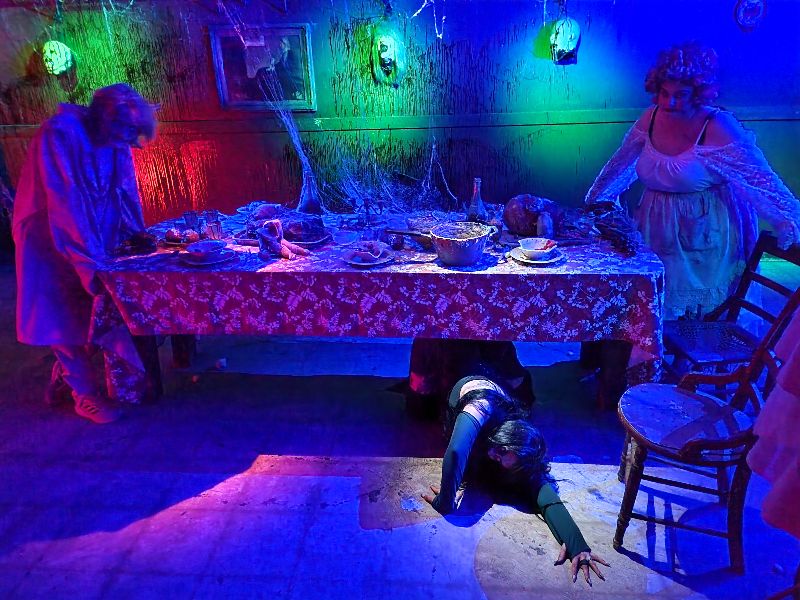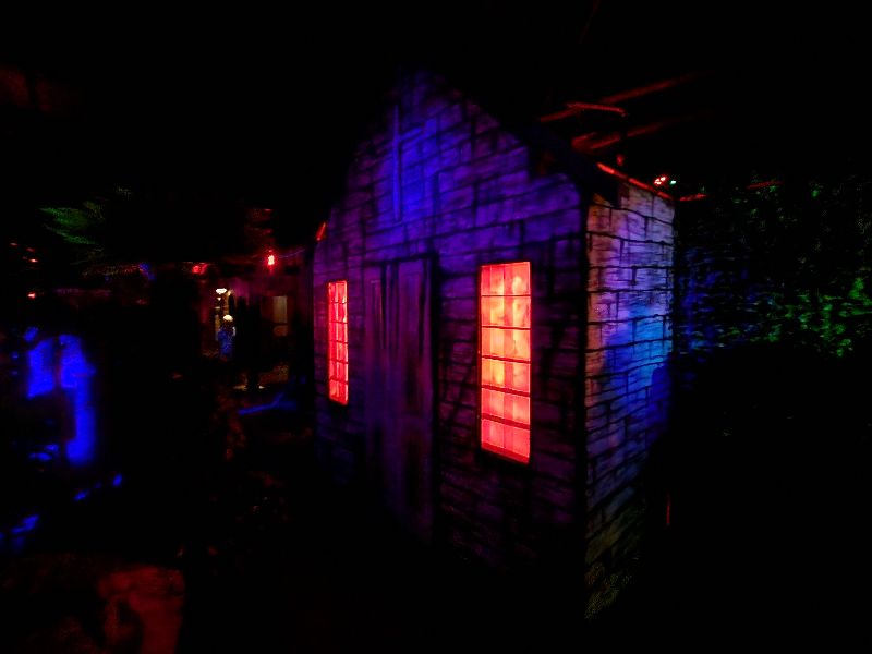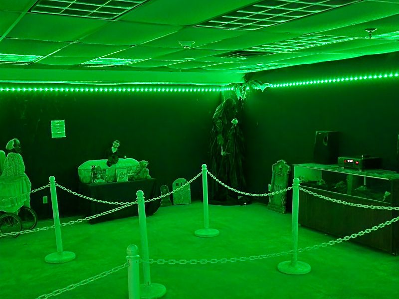 Due to local fire marshal regulations, the haunt had to install a very sensitive smoke alarm system, which unfortunately means no fog effects for now. Even a small fog machine would trigger the alarm. Despite this limitation, the team makes excellent use of creative lighting. The scenes are illuminated with pin-spot colored LEDs, casting a dim, eerie glow that enhances the tension and mystery throughout the walkthrough.