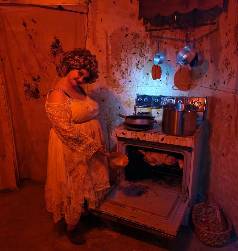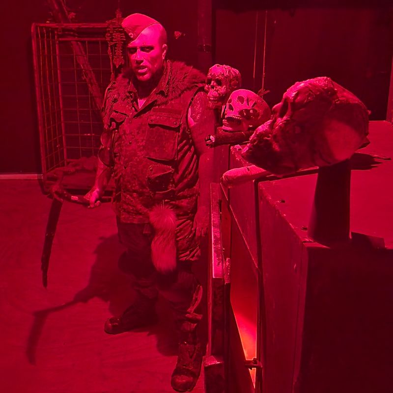 Early in our visit, we met Mama, who loudly demanded to know why we were trespassing. After a tense exchange, she softened (somewhat) and offered us a helping of her “meatloaf.” Later, we encountered Peaches (whose name, amusingly, appeared on one of our toe tags). Thankfully, we managed to slip away and continue deeper into the haunt, meeting an assortment of other eerie residents along the way. Expect to cross paths with witches, asylum patients, and, fittingly for Helen’s Bavarian setting, the uniformed scythe-carrying Maelstrom von Panzerfaust.