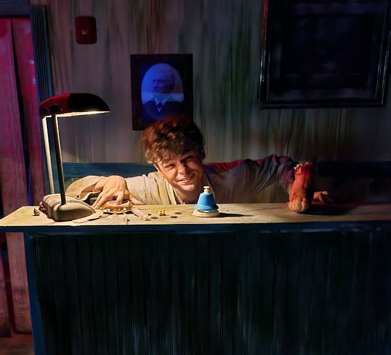 From the ticket booth, guests move into a green-lit queue area before meeting Mortimer, who sits behind his desk to recite the haunt’s rules, crack a few pun-filled jokes, and send you off toward whatever horrors wait beyond the curtain.