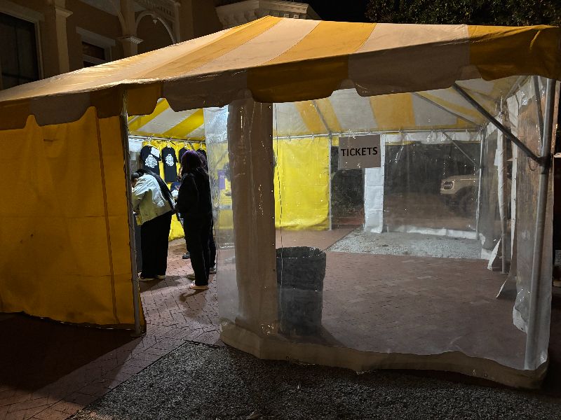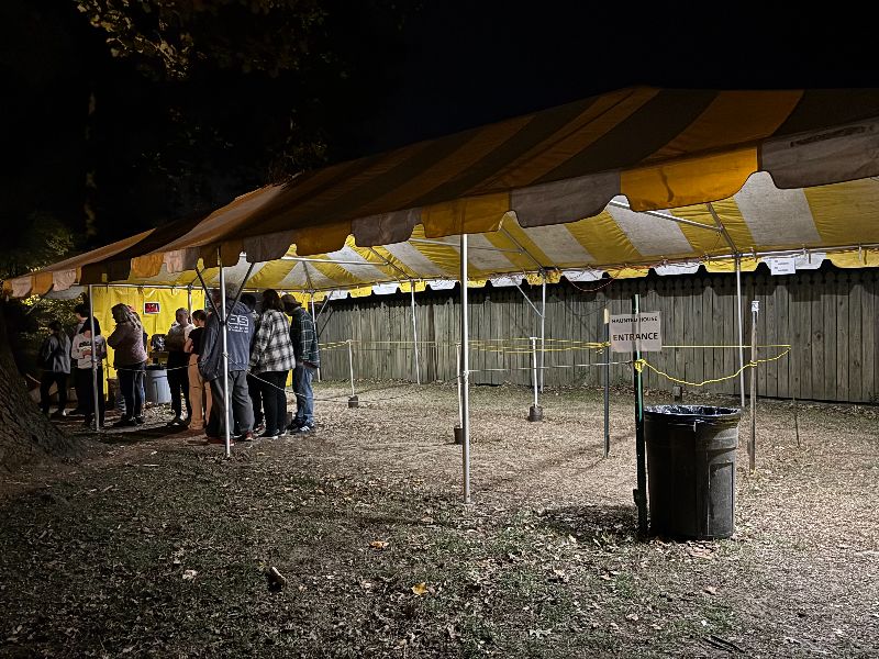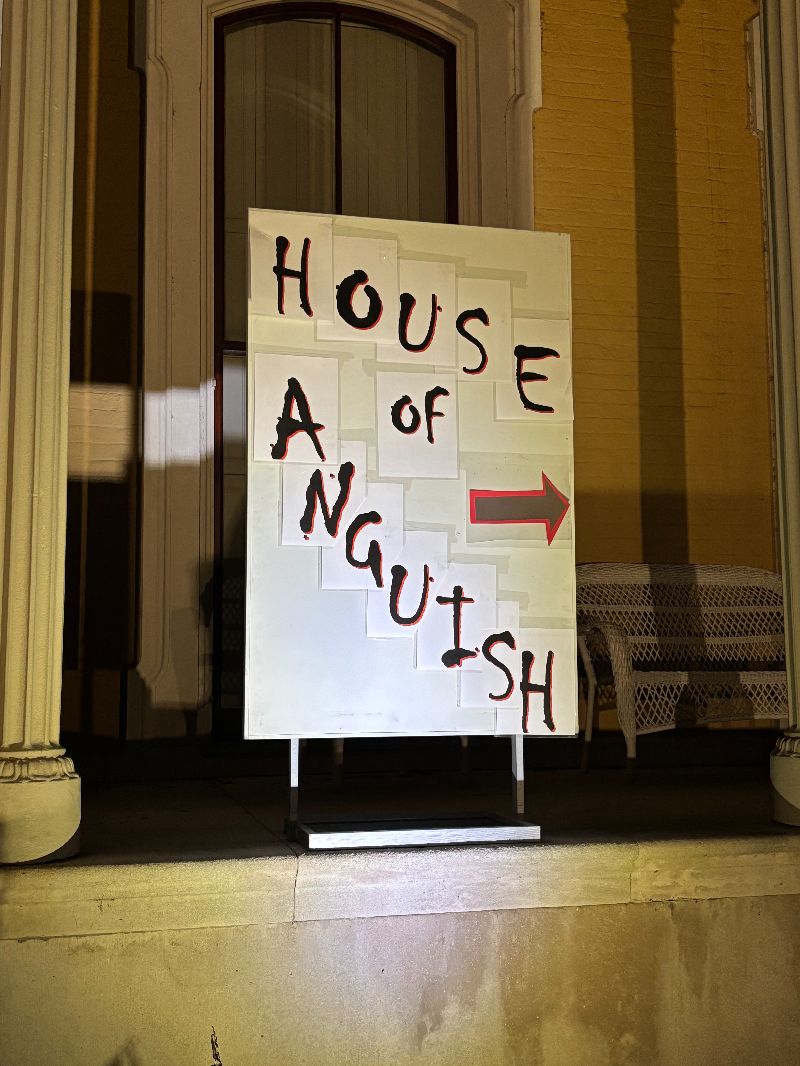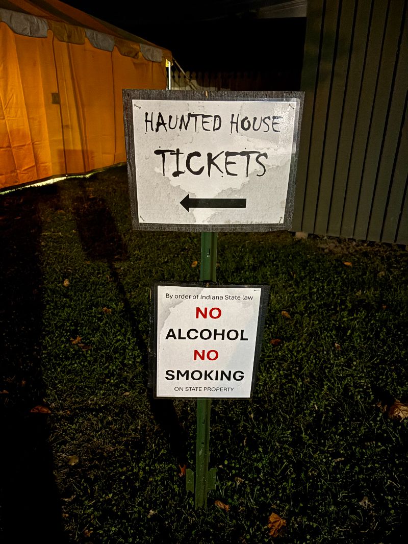 When trying to find the House of Anguish, it’s important to know that it’s held in the carriage house behind the Culbertson Mansion. If you aren’t local to New Albany and have no idea what the Culbertson looks like, it’s a big illuminated yellow mansion on the corner of the street. A lit-up sign was out front with House of Anguish on it and an arrow pointing towards the back. Parking was free on nearby streets. Once we walked around back, we found additional signs indicating which of the yellow tents was for purchasing tickets and which contained the line.
