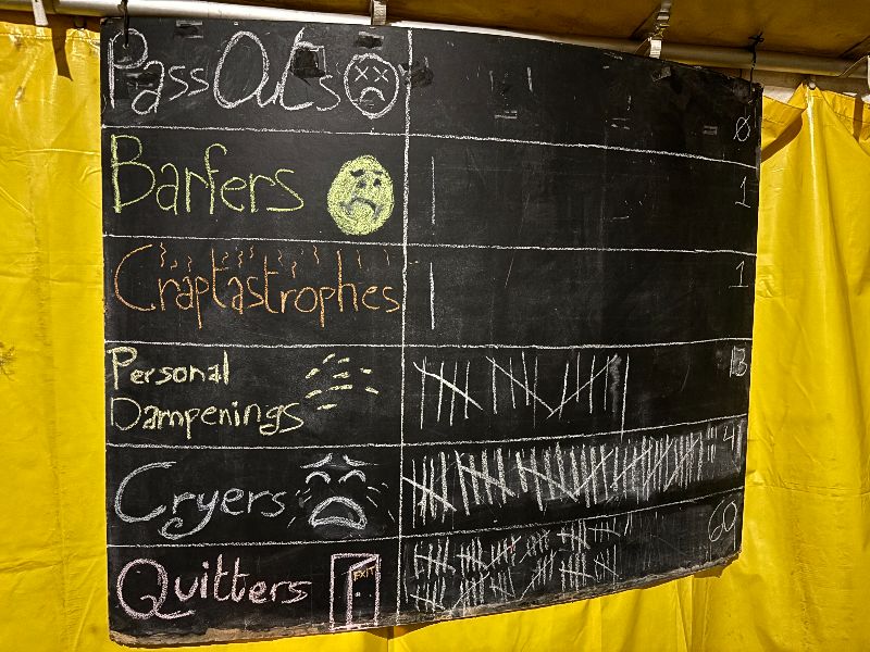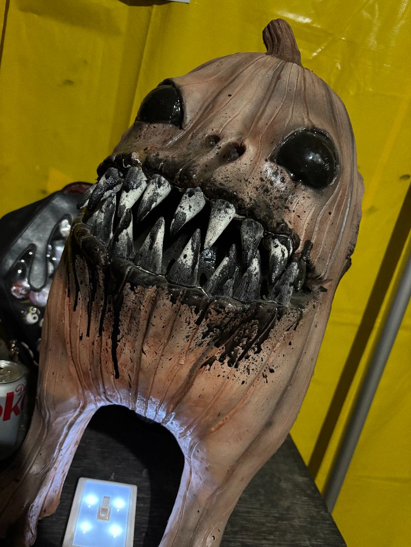 The House’s signature graveyard was overflowing with grave diggers, ghouls, and restless spirits. As a result, several came staggering- or flat-out running- to the line to torment the new bodies that had arrived! While we waited in the queue, fun spooky music played, and there was a pumpkin critter with a mouth full of sharp teeth next to the Spooky Oopsies board, where the haunt was keeping track of how many weren’t brave enough to finish the house, or couldn’t do it without tears, pee, or poo. They didn’t have any pass-outs on the board yet when we went, but the night was still young…